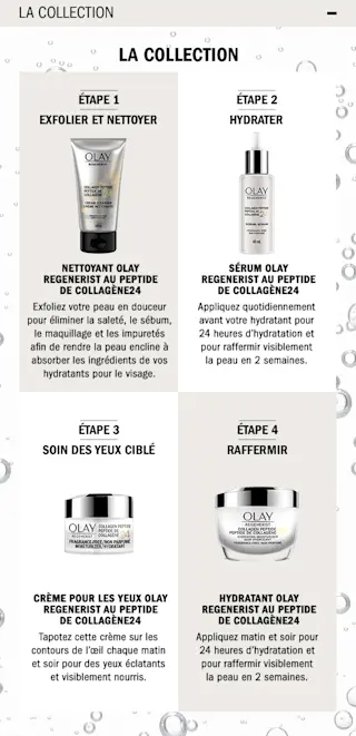 Le collagène est si important pour la peau que, dans les trois dernières années, près de 7 000 produits pour la peau avec le mot « collagène » dans le nom du produit ont été lancés dans le monde.* Malgré sa popularité, plusieurs femmes abandonnent les produits au collagène parce qu’ils sont trop chers ou parce qu’elles ne voient pas de bienfait**.*Mintel GNPD 2017-2020 ** Sondage Olay auprès de 10 000 femmes (âgées de 18 à 65 ans), É.-U. 2020